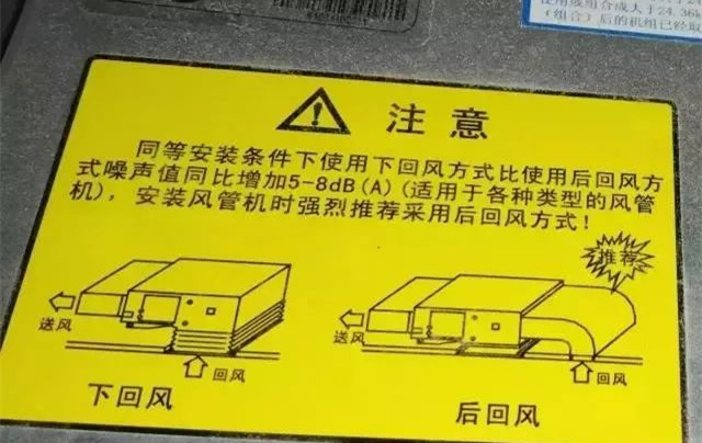 當(dāng)室內(nèi)機(jī)安裝在書房和臥室相對(duì)比較安靜的地方時(shí),請(qǐng)選擇出廠默認(rèn)的回風(fēng)方式后回風(fēng),而不是下回風(fēng),因?yàn)楹蠡仫L(fēng)的噪音比下回風(fēng)噪音小5-8分貝。內(nèi)機(jī)外側(cè)都有一個(gè)黃色標(biāo)識(shí)提示,請(qǐng)安裝人員參考。