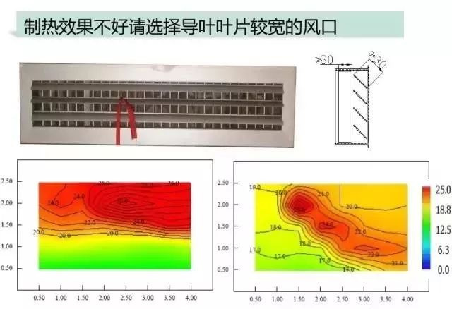 剛好內(nèi)機(jī)的制熱效果又差,排查了設(shè)備沒有問題以后就可以參照下圖,把出風(fēng)口定做成橫條在外豎條在內(nèi)的安裝方式,而且橫條的寬度在30mm左右,這樣的風(fēng)口可以把熱風(fēng)送達(dá)離地50cm左右的高度,熱氣流越低制熱效果越好,為什么家用柜機(jī)制熱效果好呢?就是因?yàn)樗x地面距離近,可以把熱風(fēng)直達(dá)地面,像地毯一樣的熱氣流慢慢往上走,人員活動(dòng)區(qū)域就舒服了。而中央空調(diào)安裝的位置高,要想讓熱風(fēng)降下來,只能是從風(fēng)口上做工作,除非你選擇了下送風(fēng)。