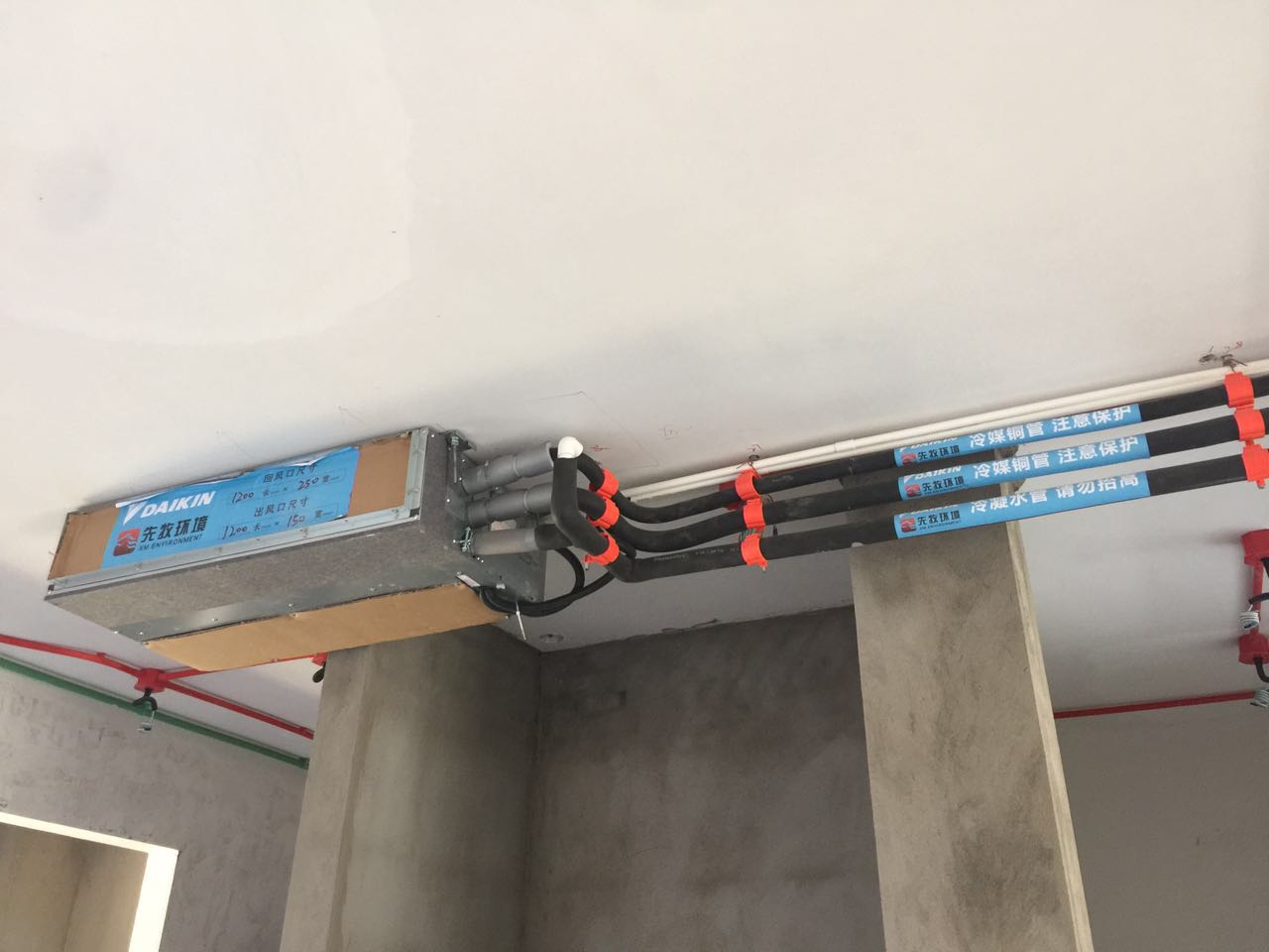 因為中央空調(diào)的安裝節(jié)點比較靠前,而后期裝修的粉塵較大;所以在中央空調(diào)安裝好之后,還要給內(nèi)機做好保護工作,用保護膜與擋板保護起來。