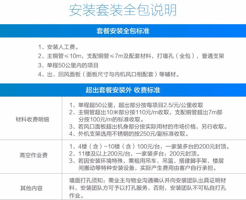 中央空調(diào)安裝費用比較高,一般都要一千多甚至幾千大洋,在下單的時候記得看上面詳情頁,看清楚是否包安裝的話,然后輔材包括哪些、附加費用(比如打孔、高空作業(yè)費)又有哪些,可別光看著標價便宜就下單了。